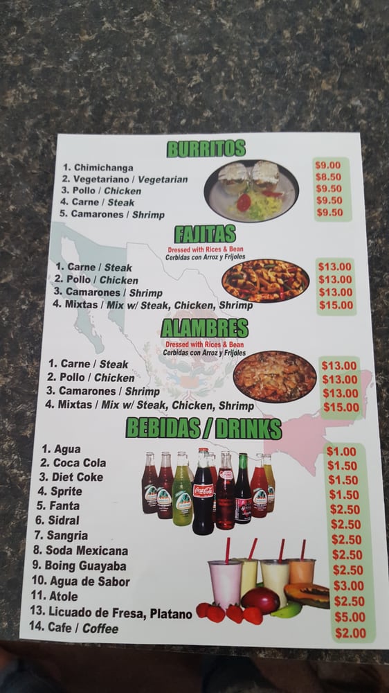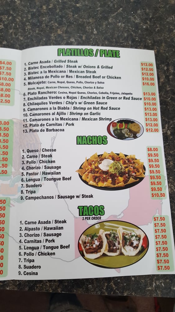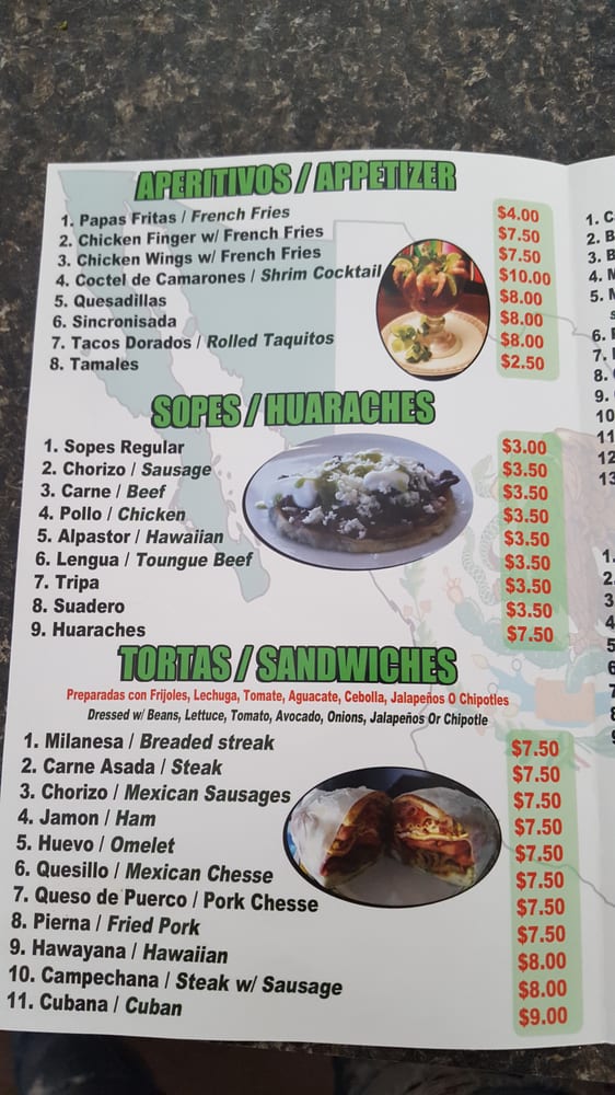 The menu features tempting appetizers like Tamales for just $2.50, in addition to a refreshing Shrimp Cocktail at $10. For heartier options, the Tortas & Sandwiches section showcases mouthwatering choices, including the classic Mexican Cheese and Steak, both priced at $7.50. Don't miss the savory Tripa Nachos for a perfect shareable treat at $9.50.